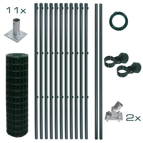 La clô ture de jardin de haute qualité est galvanisé e pour la proté ger contre la corrosion et recouverte d’ un revê tement en PVC vert. Les poteaux de clô ture sont é galement galvanisé s et revê tus de poudre.