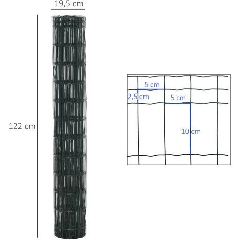 Vous avez besoin d’une clôture pour délimiter votre terrain ou pour créer un enclos pour vos poules, alors ce grillage rouleau soudé dim. 10L x 1,22H m est l’équipement qu’il vous faut. Fabriqué en acier avec revêtement PVC, doté d’un maillage dim. 5L x 10H cm, vous pourrez l’utiliser durablement et en toute sécurité. Caractéristiques : – Grillage rouleau soudé grande taille dim. 10L x 1,22H m idéal pour délimiter votre terrain, créer un espace clos pour vos poules, etc. – La taille de cette clotûre est adaptable : vous pouvez la découper à votre guise suivant les dimensions de votre terrain et vos besoins – Convient pour utilisation en tant que clotûre de jardin, barrière de sécurité, clôture décorative, enclos pour poules, etc. – Fabriquée en acier avec revêtement PVC anticorrosion, résistant : durée de vie pérenne – Montage et démontage facile, rapide (enroulable vous facilitant son rangement) Spécifications : – Couleur : vert – Matériaux principaux : acier, PVC – Dim. totales : 10L x 1,22H m – Dim. rouleau : Ø 19,5 x 122H cm – Dim. maillage : 5L x 10H cm (central), 5L x 2,5H cm (haut), 5L x 2,5H cm (bas) – Livraison effectuée en un colis – Réf. : D06-137